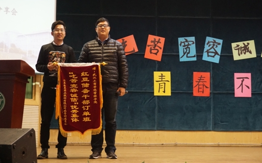 活动第三项,红豆股份公司团委书记陆平先生对红豆店长订单班项目进行讲解,提出同学要有一颗感恩的心,然后陆平先生赠予了由优秀实习生代表闫泽宇所代表的BB贝博艾弗森官方网站管理学院“红豆”服装店长订单班“吃苦•宽容•诚信”优秀集体的锦旗。紧接着,优秀实习生代表闫泽宇分享了他近半年的实习心得,并告诫同学们:读万卷书,不如行万里路,希望同学们在学习之余能多出去走走看看,学习更多的工作经验。活动最后,红豆股份公司招聘科科长唐丽娟女士为大家进行了实习宣讲,对有问题的同学进行了现场解答。