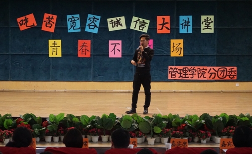 管理学院分团委宣传部讯(通讯员 彭子豪)2015年12月10日下午14点,由我院举办的第三届“吃苦•宽容•诚信”宣讲学习会之青春不散场在体育馆402成功举办。本次会议由管理学院刘玉青老师主持召开,出席本次活动的嘉宾有红豆公司人力资源部部长蒋中一、团委书记陆平、招聘科科长唐丽娟、孙翎炎,管理学院常务副院长李明老师、党总支书记吴茜老师、党总支副书记王龙老师、管理学院分团委书记欧阳晓晶老师、工商系主任黄霞、窦先琴老师以及各系辅导员们,还有此次会议的主讲人,工商管理系优秀实习生代表,原我院学生会主席闫泽宇同学。