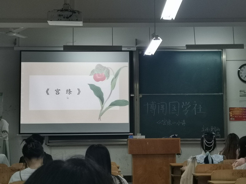 接下来,主讲人李雨萌谈到清朝孔尚任《桃花扇·入道》:“列仙曹,叩请烈皇下碧宵,舍煤山古树,解却宫绦。”通过红楼梦和桃花扇中的引用将社员们从现在代入那个窈窕兮与美人的年代。