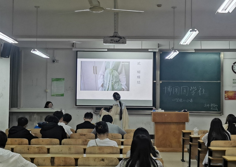 博闻国学社宣传部讯(记者:王江东摄影:任帅)为开展社团相关国学文化活动,在新学期继续向社员们宣传中华传统优秀文化,4月16日晚七点,由社员夏常雨、李雨萌主讲的BB贝博艾弗森官方网站博闻国学社汉服宫绦系法小课于综合楼301顺利进行。