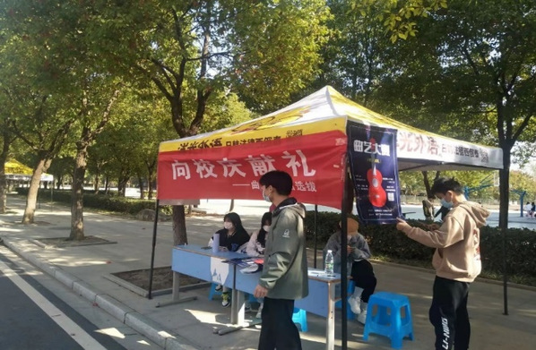 曲艺大赛摆点宣传活动中部委值班采取轮流站班的形式,五至六人一班,每过一小时换班值日,摆点值班部委的任务就是负责对曲艺大赛信息进行宣传,并且对感兴趣的同学介绍相关内容和比赛机制,再收集有参赛意向的同学的联系方式,方便后期咨询。可刚开始摆点的现实中的情况,远不如初期规划那般顺利,不断地碰壁,不断地遭受拒绝,让部委们有些气馁。但在短暂休息过后,大家又继续地穿行在下课的人流中,把握着课间,为的就是不遗漏才艺双全的学生为校庆献艺献礼。