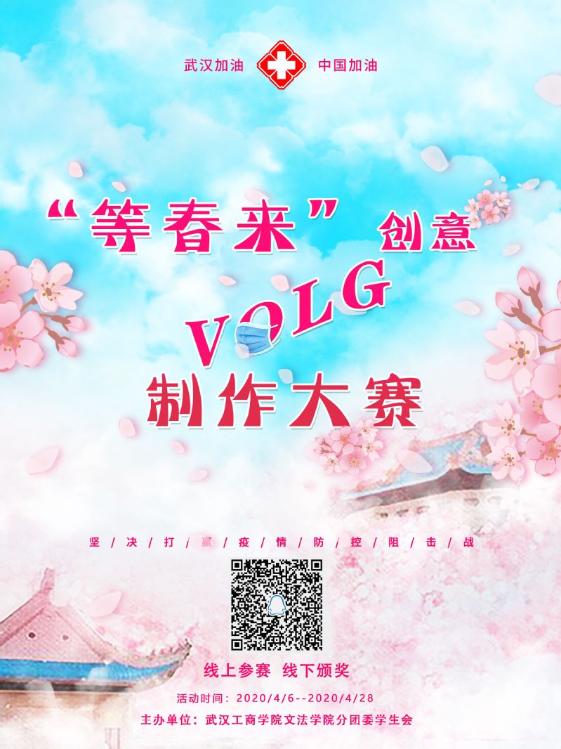 在四月,武汉又迎来了春天,樱花绽放的季节,但由于疫情的原因,我们无法与朋友携手享受这美好的瞬间,但是我们可以将自己在疫情期间生活中的美好记录下来。在此基础上,文法学院召开了“”线上参赛,线下颁奖“ ——等春来”创意vlog视频制作大赛。同时希望通过这次活动可以提高自己的视频制作能力,丰富同学们的居家生活,发现生活的美好。