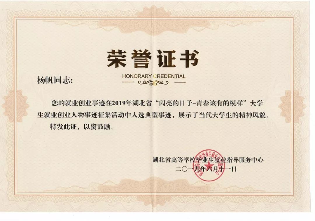 文法新媒体(记者 林紫芩)杨帆,2016届文法学院法学学生,在2019年湖北省“闪亮的日子——青春该有的模样”大学生就业创业人物事迹评选中,从全省近千余名学生中脱颖而出,被评选为基层就业大学生典型。