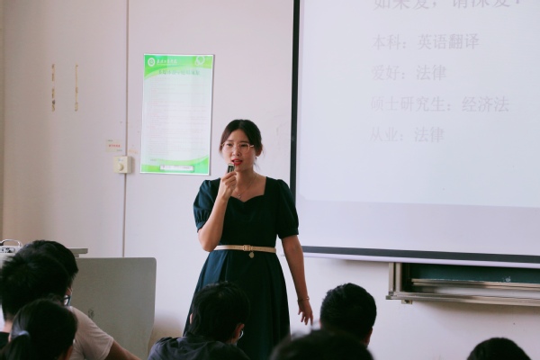 讲座开始,张颖律师先做了个简短的自我介绍,她有着多种身份:她获得中国政法大学经济法硕士学位,她也是中国法学会会员、中国商业研究会法学分会会员、武汉百年职校兼职法律教师,现在她创办了武汉时光颖品企业管理咨询有限公司担任董事长。张颖律师丰富的履历,让在座的新生对于讲座也充满兴趣。