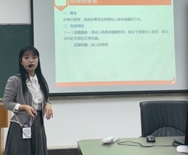 最后,法学的胡越老师带来故意伤害罪的磨课讲授。她从实际案例入手,引导学生们逐步理解故意伤害罪的相关法律条文和实际应用。胡老师的讲授感染力十足,声音随着讲授的示例有所起伏,牢牢抓住了在场同事们的注意力。通过逻辑清晰和生动的讲授,让理论知识深入浅出、便于理解。点评环节中,她的讲课得到了督导王教授的高度评价。