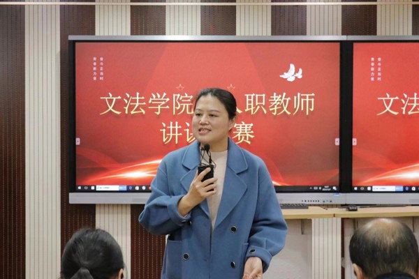 本次活动由教务部副部长周本爽、教师发展中心主任陈敏、文法学院党总支书记陈敏、文法学院副院长林翔、文法学院法学系教授范红霞担任评委,文法学院教学副院长华丽娜教授主持本次新教师讲课比赛。