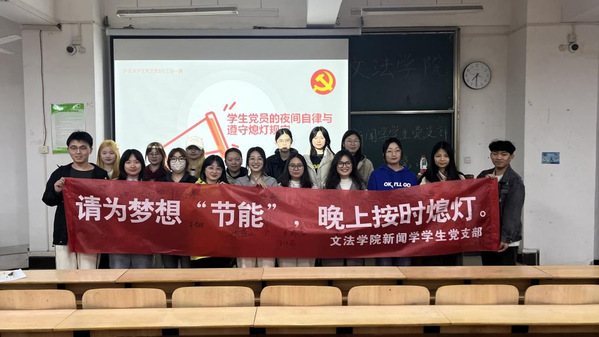 新闻学学生党支部 (记者:董世泉)2024年3月12日,BB贝博艾弗森官方网站文法学院新闻学学生党支部开展了关于倡导“党员同志做好自觉熄灯的带头作用”的活动,在本次活动中主讲人蔡昀芮给支部的党员、预备党员同志们讲述了我们应该如何履行好自觉熄灯的要求,以及怎样起好带头示范作用,督促大家养成良好的生活习惯,培养自律的良好品质。