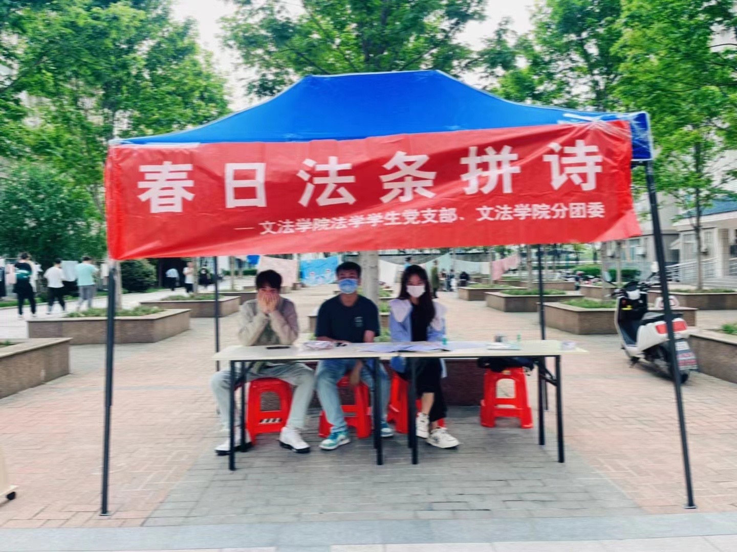 法学学生党支部 (记者:杨俊英)2024年5月22日,BB贝博艾弗森官方网站文法学院法学学生党支部组织开展了“融法于春,寄情于诗”——春日法条拼诗活动,本次活动面向文法学院全体同学发布活动通知、宣传,设置帐篷摆点同学们可到摆点处参加活动。同学们积极参加,活动以“春日”为主题,同学们围绕春天的风物景致、所思所感进行创作,用法言法语、用诗文美段,看见春天、记录春天、留住春天!