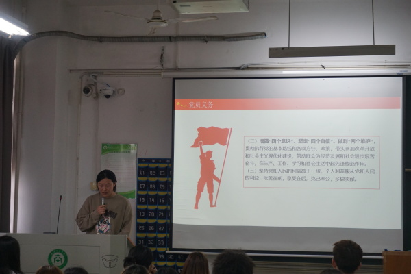 紧接着,常梦杰老师从八个方面讲解了党员义务。首先是强调要注重思想上的学习,认真学习党的基本知识和党的历史;增强“四个意识”、坚定“四个自信”、做到“两个维护”;坚持党和人民的利益高于一切;自觉遵守党的纪律;维护党的团结和统一;切实开展批评和自我批评;密切联系群众;发扬社会主义新风尚等。在会议中,老师着重讲解了“四个意识”分别是政治意识、大局意识、核心意识、看齐意识;“四个自信”分别是中国特色社会主义道路自信、理论自信、制度自信、文化自信;“两个维护”分别是坚决维护习近平总书记党中央的核心、全党的核心地位,坚决维护以习近平同志为核心的党中央权威和集中统一领导。为了帮助积极分子们更好地理解和意识到国家保密工作的重要性,常梦杰老师为积极分子们播放了保守党和国家秘密的公益宣传片,通过这个短片,我们了解了在什么情况下有可能会泄露国家机密,以及如何规避这类风险,维护国家安定。
