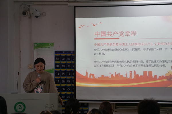接下来,常梦杰老师以中国共产党章程为切入点,介绍了党员的申请条件,并且强调指出中国共产党党员是中国工人阶级的有共产主义觉悟的先锋战士,必须全心全意为人民服务,不惜牺牲个人的一切,为实现共产主义奋斗终生。中国共产党党员永远是劳动人民的普通一员,除了法律和政策规定范围内的个人利益和工作职权以外,所有共产党员都不得谋求任何私利和特权。