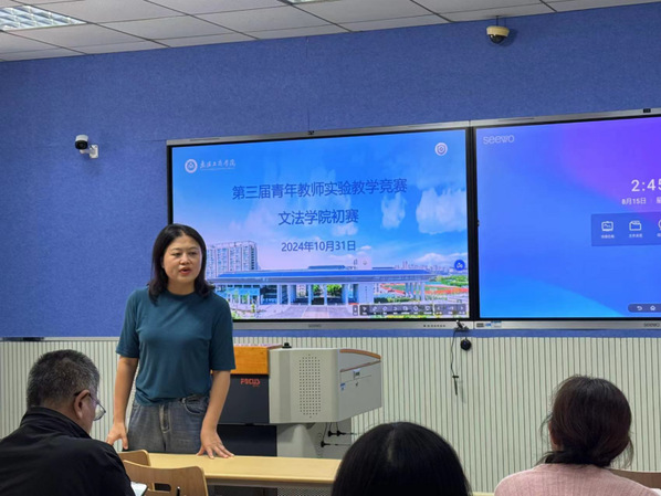 2024年10月31日下午2:20,文法学院于外语楼207智慧教室举办实验教学竞赛初赛“说课”比赛,比赛由文法学院教学副院长华丽娜副教授担任主持人,实验教学中心副主任毛志山、文法学院院长助理毛毅、网络与新媒体系主任陈媛媛、广告系主任罗青、新闻系主任亢海玲五位教师担任评委,文法学院全体新入职教师观摩学习。
