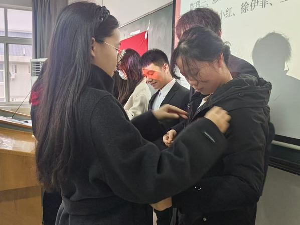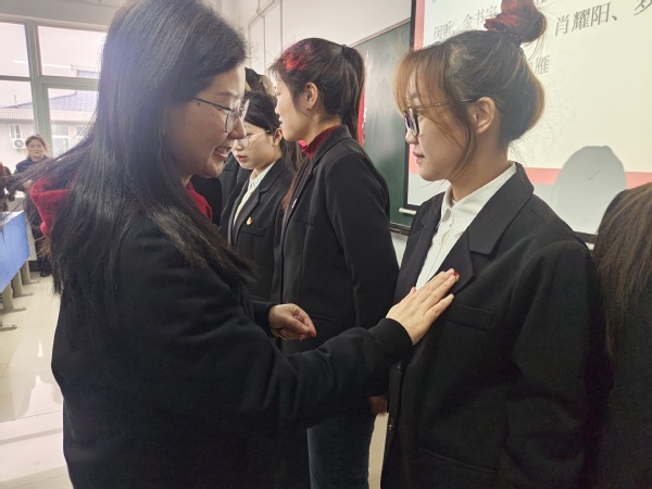宣誓完毕后,会议第五项议程,由陈敏书记,张盼盼老师,常梦洁老师三位老师以及党员代表们联袂为新发展预备党员们授予党徽。新党员们抚摸着胸前的党员徽章,感受着那份沉甸甸的责任。从此,党徽将时刻提醒着他们,要以党员的标准严格要求自己,不忘初心,牢记使命,为党的事业奋斗终生。