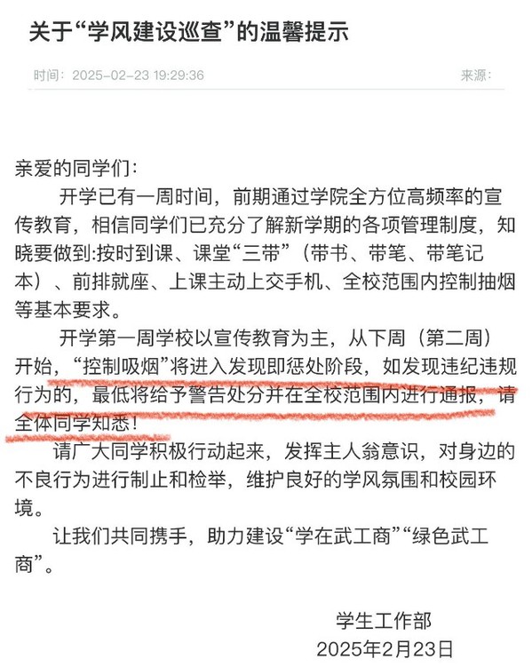 (文法学院新闻系 李莉莉、梅雨晴、黄鑫蓉、闵小雪、唐方婧、严妍) BB贝博艾弗森官方网站2025年2月23日发布关于“学风建设巡查”的通告,内容指出:开学第一周学校以宣传教育为主,从下周(2月27日起)开始,“控制吸烟”将进入发现即惩处阶段,如发现违纪违规行为的,最低将给予警告处分并在全校范围内进行通报。