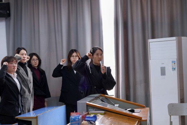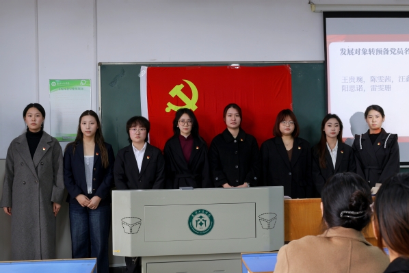 第三项议程,宣读发展对象转预备党员以及讨论预备党员转正式党员名单。主持人宣读完毕后,进行第四项议程,由新闻学学生党支部书记刘易鑫老师带领新发展党员宣誓。