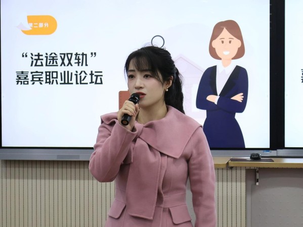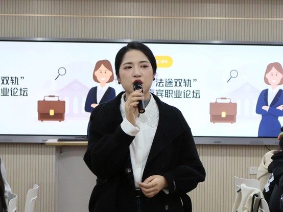 活动伊始,学院党总支书记陈敏围绕法治行业发展趋势发表致辞,鼓励学生夯实专业基础、找准职业定位。她特别强调了法学筑梦系列活动的连贯价值:从第一期的价值观塑造,到第二期的职业准备,再到本次的职业选择,形成了完整的培养链条。在核心环节法途双轨职业论坛中,嘉宾们结合一线工作经历,聚焦司法审判实务、企业合规管理等核心议题展开分享,他们分析了公务员岗位中政策执行与行政管理的具象要求,也深入探讨了律师行业中案件辩护与法律服务的专业技能。通过真实案例的剖析,揭示了两种职业路径在工作内容、发展轨迹、能力要求和生活方式等方面的本质差异,并针对学生提出的实习就业、职业规划等问题逐一解答,搭建起学界与业界的高效沟通桥梁。
