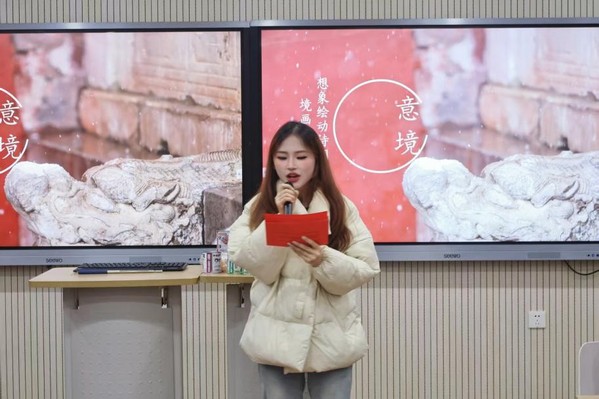 本次活动以弘扬中华优秀传统文化为核心,搭建起古典诗词与现代艺术创作的沟通桥梁。活动以4-6人跨班级小组为单位,打破专业壁垒,推动不同专业创意思维深度交融。主持人田欣兰现场展示涵盖辛弃疾《青玉案·元夕》、柳宗元《江雪》等经典篇目在内的词库,通过短视频播放与图文讲解相结合的方式,深入拆解诗词意境、作者生平背景与作品情感内核。各小组在5分钟的紧张规划后,敲定创作主题、画面构思、色彩风格及接力顺序,一场诗词与画笔的邂逅正式拉开帷幕。