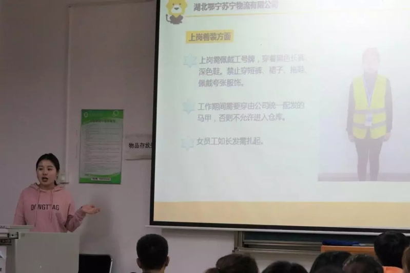 潘聪总监为参训学生详细介绍了苏宁产业布局和苏宁物流的发展历程。并强调在实训期间要端正心态,认真学习实习安全守则和物流实际操作知识,注意理论与实践相结合,才能顺利完成课程任务。