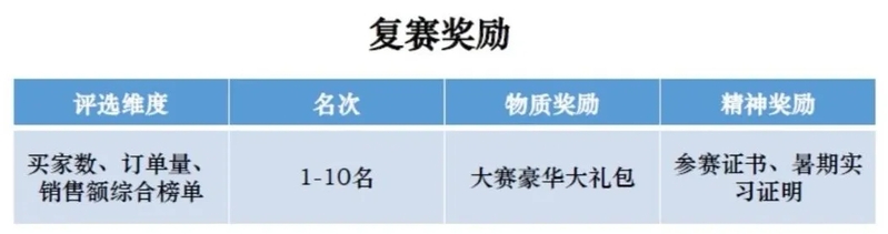 大赛各环节不做淘汰,7 月 1 日复赛开始,所有选手可以继续推广,每周大赛组委会会发布买家数、订单量、销售额加权求和后的综合榜单,7 月 30 日将根据自参赛以来的累计推广数据发布复赛最终榜单。