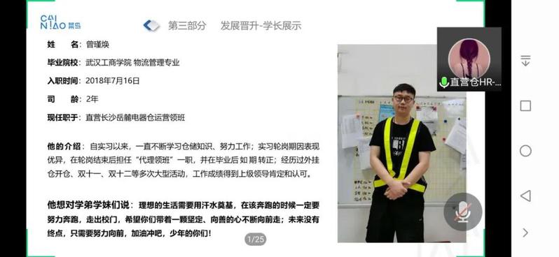 7月1日上午9:30,菜鸟供应链直营仓招聘宣讲会在线上召开,该公司华中大区人力行政部人事主管刘永玲负责宣讲,2017级物流管理和物流工程专业72名学生参加宣讲。