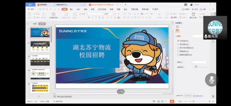 630日上午930,第一场线上校园招聘会——湖北鄂宁苏宁物流有限公司招聘会开展宣讲。该公司招聘经理戴光宗主讲。物流学院2017级物流管理及物流工程共96位同学听取线上宣讲。