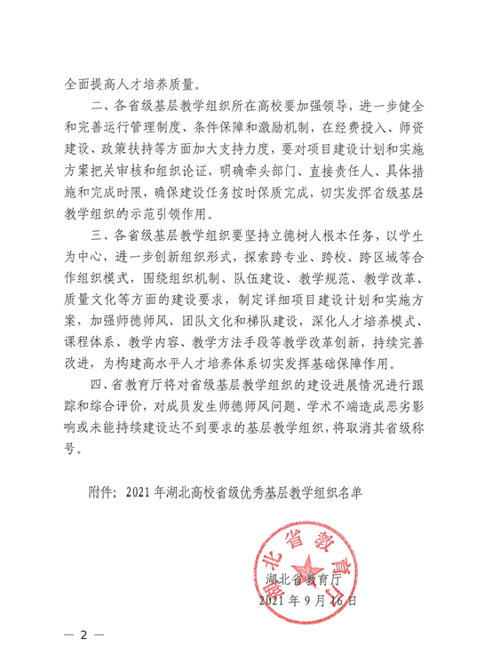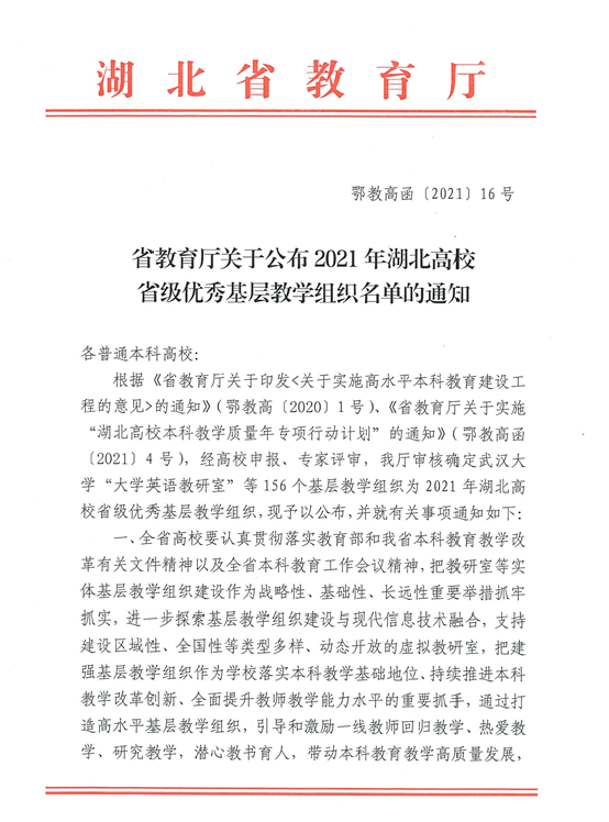 9月16日,湖北省教育厅公布了2021年湖北高校省级优秀基层教学组织名单(鄂教高函{2021}16号),BB贝博艾弗森官方网站的智慧物流教研室、跨境电商教研室、视觉传达设计教研室、广告学专业教研室4个基层教学组织获批,这是学校继旅游管理系教研室、生物制药教研室、企业法律实务教研室3个教学组织获评湖北高校省级优秀基层教学组织后,在基层教学组织方面取得的又一成绩。