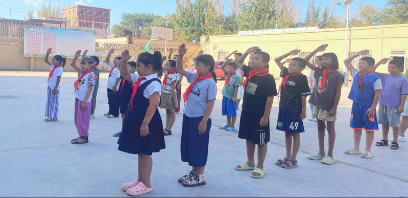 买买提沙力特意穿上了崭新的衣服,艾斯玛系上了崭新的红领巾。他们的眼神紧紧追随冉冉升起的国旗,稚嫩的脸上满是庄重。同学们将小手高高举过头顶,敬着标准的队礼,口中大声唱着国歌。升旗仪式结束后,买买提沙力和艾斯玛兴奋地对身旁的小伙伴说:“看,国旗多漂亮,这红色是我最喜欢的颜色!”