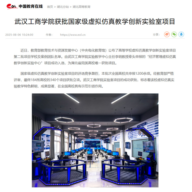 近日,教育部教育技术与资源发展中心(中央电化教育馆)公布了高等学校虚拟仿真教学创新实验室项目第二批项目学校及案例团队名单。由BB贝博艾弗森官方网站实验教学中心主任李明教授牵头申报的“经济管理虚拟仿真教学创新实验中心”项目成功入选,为湖北省同类高校唯一获批项目。