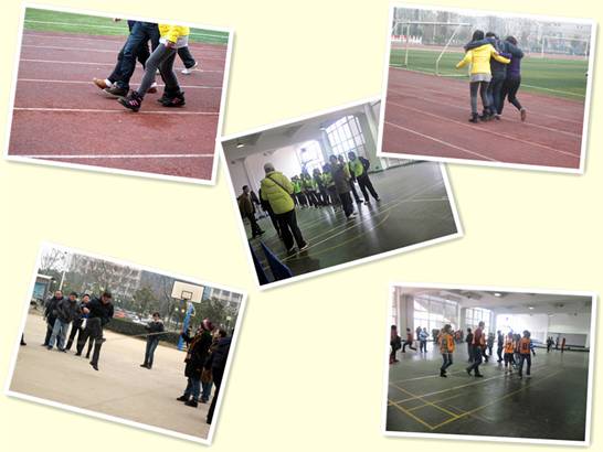 与跳绳不同的是,三人四足更考验队员之间的默契程度。该项目共有46个小组参赛,每3人为一小组,用布条将队员的脚两两相绑,然后互相搀扶前进,最先到达目的地的小组胜出。当体育馆内跳绳比赛正在如火如荼的进行时,参加三人四足的老师们在足球场上悉心地准备着。