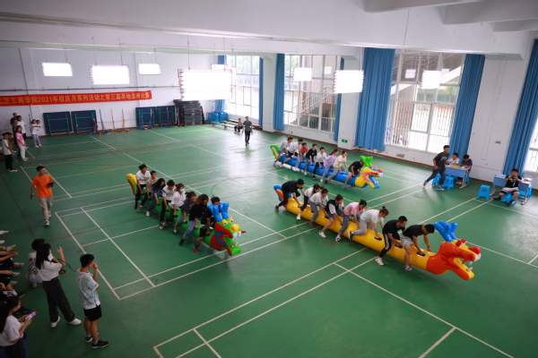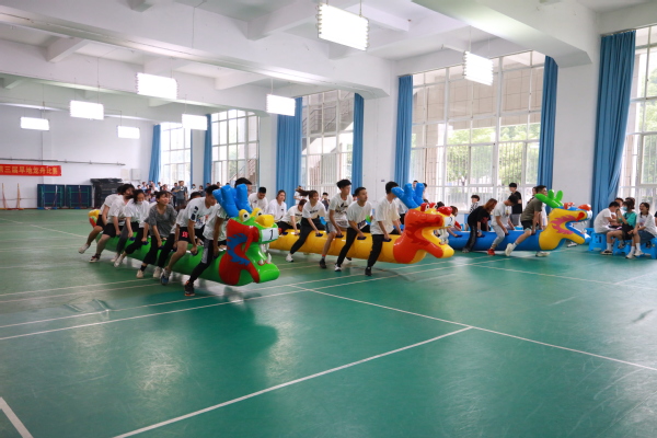 在旱地龙舟赛的赛场上,随着号令的响起,来自各学院的8支代表队如弓箭离弦般向前冲出去,队员们团结默契、行动敏捷,在欢笑声、加油声中奔向终点。