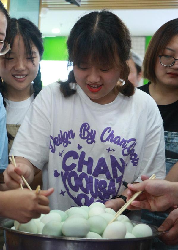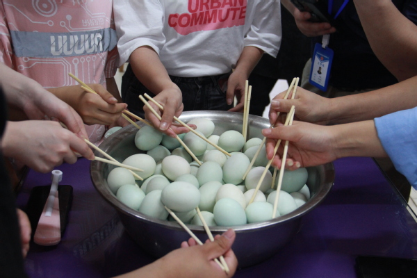 此外,工作人员还组织了趣味小游戏,一盆又大又圆的咸鸭蛋被端上桌,同学们需挑战在1分钟之内用筷子夹鸭蛋,夹得多者即获胜,获胜的同学可将自己的胜利品带走。只见现场不少同学跃跃欲试,一颗颗圆滚滚的鸭蛋在两根筷子间“摇摇欲坠”,一不小心便会跌落下来,挑战的同学们一个个聚精会神,围在一旁的同学们纷纷加油打气,最后不少同学“用巧劲”成功夹到了鸭蛋,满载而归。