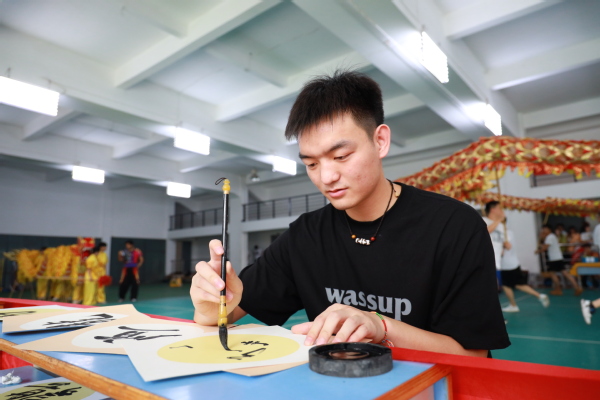 图为现场观众体验传统书法 摄影:张誉东