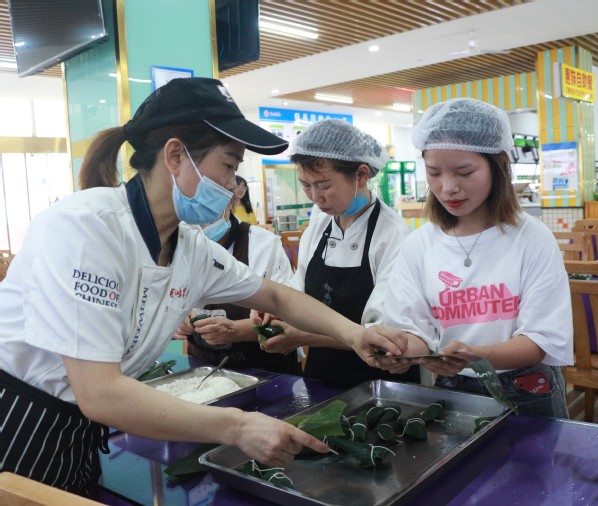 图为工作人员正在教学生包粽子 摄影:尹芊