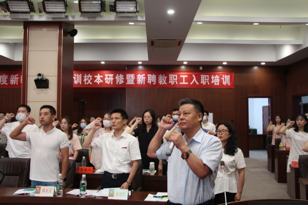 新闻中心讯(记者 苏文豪 特约记者 万梦兰)“忠诚党的教育事业,遵守教育法律法规,恪守学术规范,潜心问道,教书育人……”7月7日下午2:30,BB贝博艾弗森官方网站2022年暑期新入职教师实训营在图书馆第四会议室拉开帷幕,83名新教职工在国旗下庄严宣誓。BB贝博艾弗森官方网站校长孔建益,党委书记刘生元等校领导,人力资源部部长邢赛鹏,学工部部长陈义文,教务部常务副部长陈涛,教师发展中心主任陈敏,环境与生物工程学院教授杨文婷等参加开营仪式。仪式由邢赛鹏部长主持。