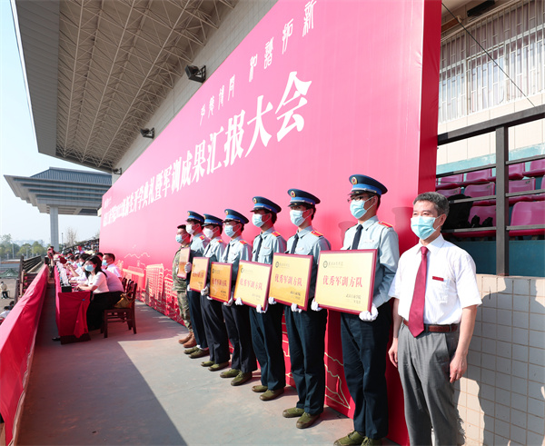学工部部长陈义文宣读了《关于表彰2022级优秀军训方队、优秀军训学员的决定》,黄陂区人民武装部领导、校领导分别为获奖代表颁奖。