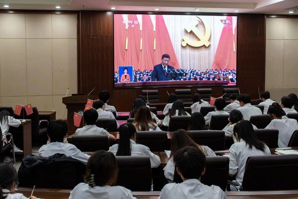 图为学生干部观看二十大开幕会 摄影:王夏平