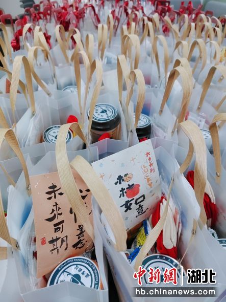 “里面的物品饱含着我们对考研学生真挚的爱和美好的期盼,寓意‘榜上有名’的棒棒糖、‘信’心百倍的明信片、‘暖手暖脚更暖心’的奶茶和袜子,‘马到成功’的书签,加油打气的旺旺仙贝、‘面面俱到’的防疫口罩……”在现场发放福袋的该校环境与生物工程学院党总支书记陈玲细心介绍起了礼品的寓意。