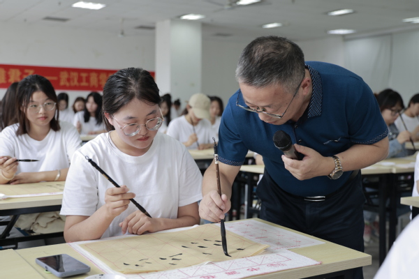 图为左宗文副校长指导学生练习书法 摄影:芮雨欣