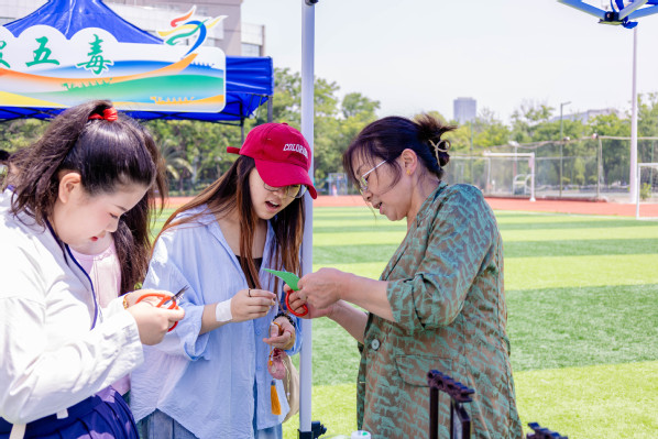 活动还吸引了学校不少留学生的积极参与,来自尼泊尔的留学生尼锐与来自伊拉克的海德、义博3人一起组团参加了旱地龙舟比赛,表示既新奇又充满挑战。尼锐说道:“这比普通赛跑有趣多了,我在尼泊尔从没有参加过这样的活动。”海德也表示这是一次特别开心的体验。“提着龙舟跑比想象中累,虽然不用下水,但团队配合很重要,我们中途差点摔倒。”他们3人还依次前往各个活动展位前“打卡”,感受端午节的独特魅力和中华传统文化的博大精深。