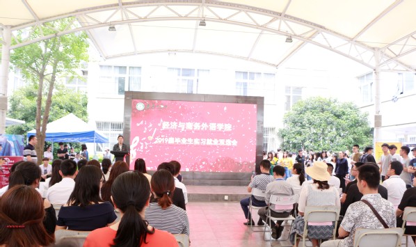 新闻中心讯(记者 谭兰 毛琪格)5月24日中午12:30,BB贝博艾弗森官方网站经济与商务外语学院2019届毕业生实习就业双选会在学校外语楼中庭举行,18家用人单位来校招聘选拔人才。校长助理、人力资源部部长亓小林,招生与就业部部长朱宜,学生工作部副部长吴艳,教务部实践教学科科长牟岩、老师马振东,经济与商务外语学院副院长马洁以及全体系主任、辅导员老师和2019届毕业生部分代表参加了此次双选会。双选会由经济与商务外语学院党总支书记、副院长胡航主持。