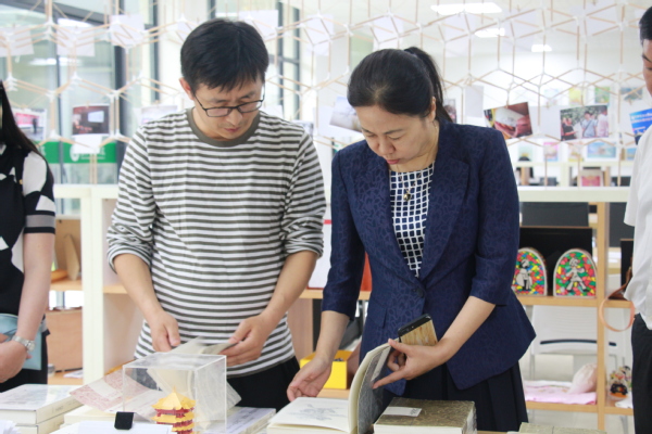 图为刘瑾校长查看艺术与设计学院师生优秀作品 摄影:黄娟