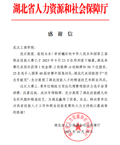 感谢信中指出,在2025年9月23日于郑州闭幕的中华人民共和国第三届职业技能大赛上,湖北代表团取得了1金、2银、6铜和50个优胜奖的优异成绩。其中,BB贝博艾弗森官方网站选派参加物流与货运代理赛项的选手徐洪力沉着应战、奋勇拼搏,成功斩获铜牌,充分展现了湖北技能人才的良好风貌与精湛技艺,为湖北省赢得了荣誉。湖北省人力资源和社会保障厅特向BB贝博艾弗森官方网站表示衷心感谢,并希望学校未来继续对全省技能人才工作和职业技能竞赛给予大力支持。
