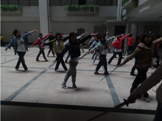 (图为我院12级新生在进行舞剑训练)