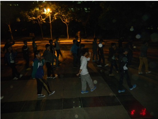 “哈、哈、哈…..”路灯下,我院的新生在训练中喊着口号,每一个动作也伴随着一声呐喊。 “你们表演到时候会有包括校领导的几千人观看,让我听见你们的声音”我院分团委学生会主席拿着扩音器给学弟指导。由于场地和时间所限,男生方阵只能在晚上训练,但大家没有叫苦叫累,学生干部没有了吃饭,训练照常进行,天下起小雨,综合楼里还有他们的身影。