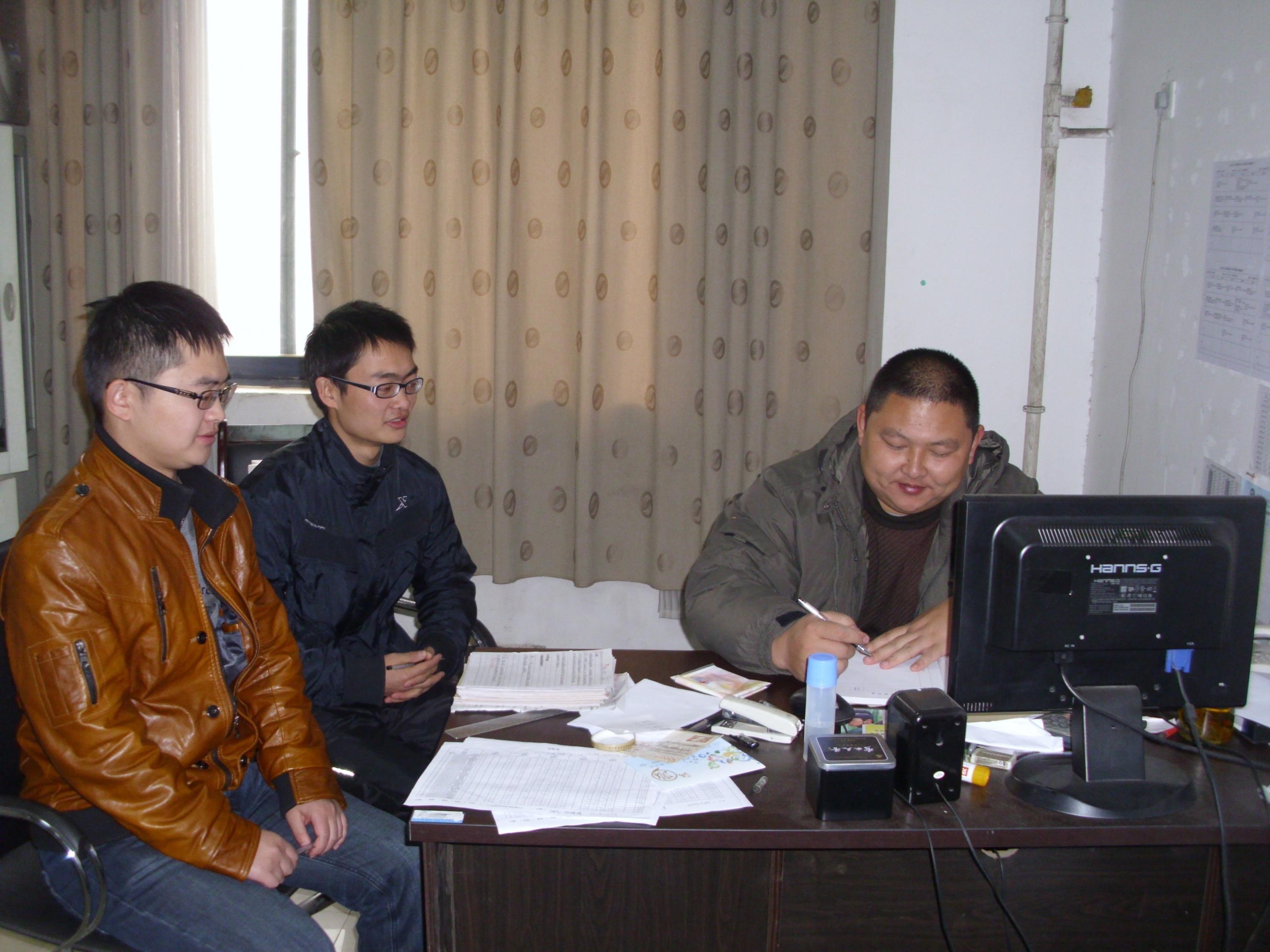 2012年11月9日,在综合楼813办公室,工学院辅导员杨大虎老师与10级生物工程专业两个本科班班长马祖松和禹彬关于学生就业方向、学生当前学习状态进行了访谈。