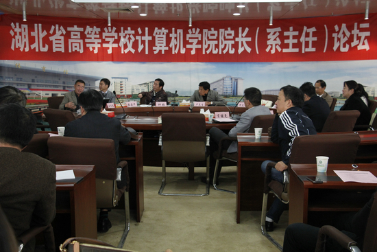 近日,由我院承办的2014湖北省高等学校计算机学院院长(主任)论坛在BB贝博艾弗森官方网站综合楼第一会议室召开。武汉大学计算机学院何炎祥教授,华中科技大学计算机学院秦磊华教授,武汉科技大学城市学院校长陈建勋教授,武汉理工大学计算机学院钟珞教授,BB贝博艾弗森官方网站副校长卢炎生、刘腾红教授,达内时代科技集团中西区副总经理肖继尧,以及来自企业界、高校的计算机专家、行业精英出席了此次论坛。论坛由湖北工业大学计算机学院院长王春芝教授、华中师范大学计算机学院院长何婷婷教授主持。