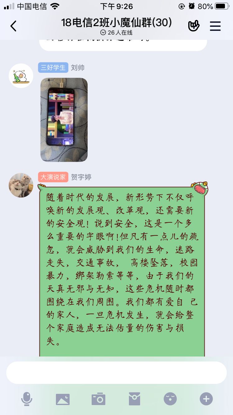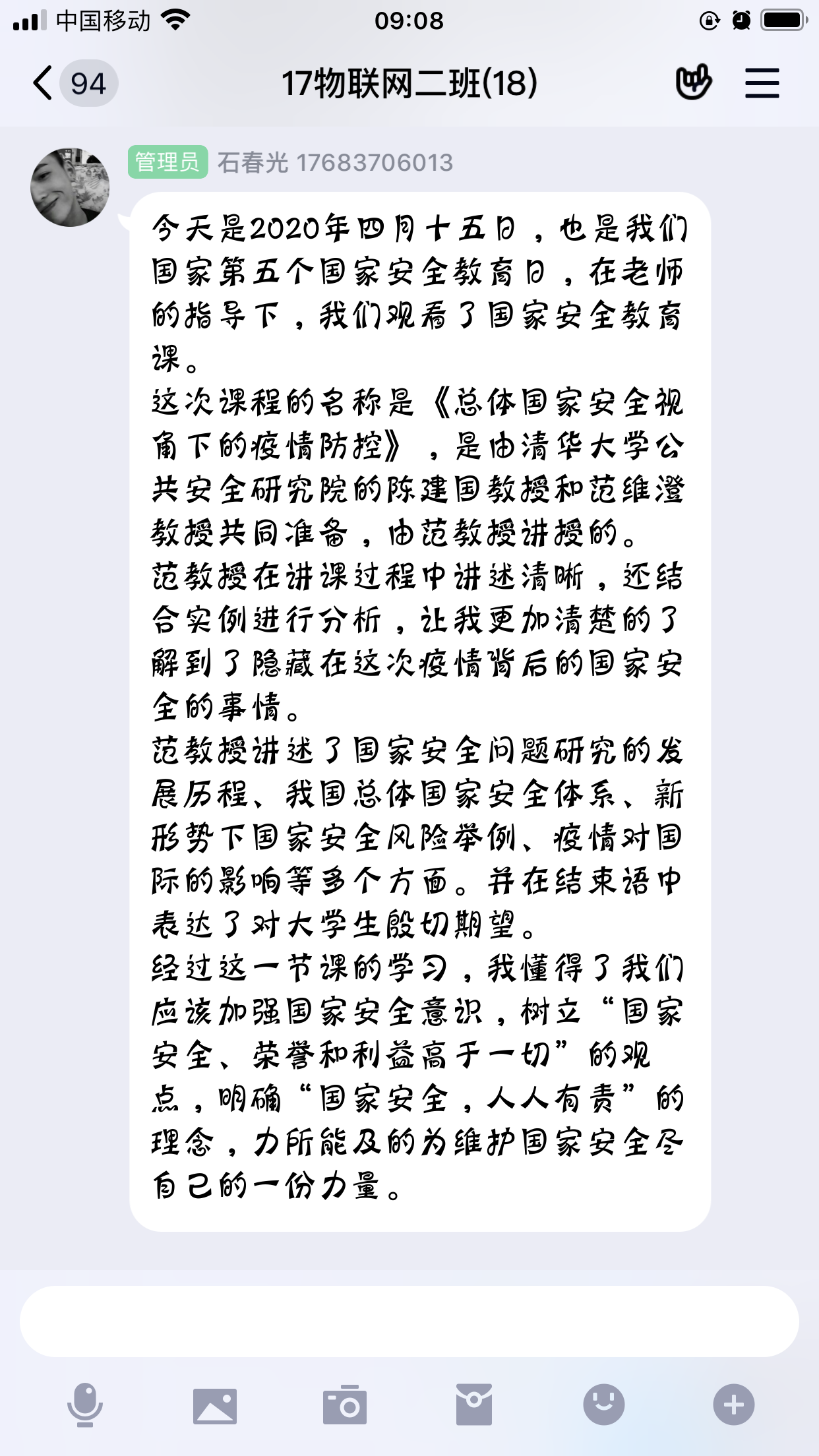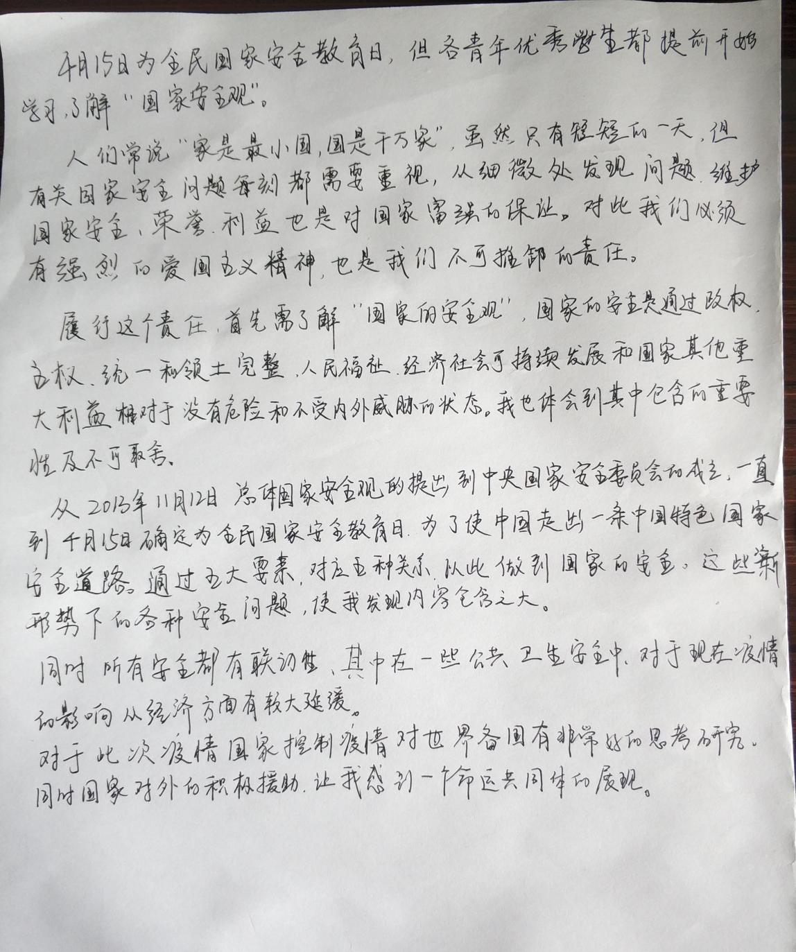 2020年4月14-15日,组织学生观看了全民国家安全教育日的公开课和直播课,让我受益匪浅,也对国家安全有了全新的认识。国家安全包括政治安全、国土安全、军事安全、经济安全、文化安全、社会安全、科技安全、网络安全、生态安全和资源安全。国家安全是国家生存和发展最基本、最重要的前提。它关系国家稳定,关系社会长远发展。通过这次新冠肺炎疫情的爆发,也可以看出我国各种可以预见和难以预见的风险因素有很多,维护国家安全和社会稳定任务繁重艰巨。从这个意义上说,维护国家安全既是国家责任也是公民责任。虽然全民国家安全教育日只有一天,但是,平日我们就应该加强国家安全的重要性的宣传,把国家安全认识的种子播种在学生心中,让大家居安思危,虽处和平年代,但也不能忘记潜在的威胁。国家之安,人民至上。维护祖国和平稳定,人人有责!