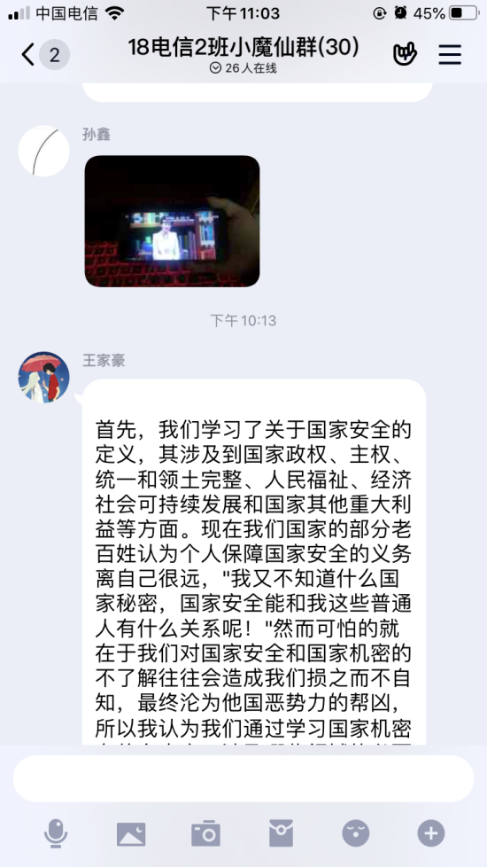 4月15日的《同上一堂国家安全教育课》课堂主要以国家安全教育、生物安全为主要资料展开。首先,贴近实际的事例、丰富的国家安全知识资料不仅仅让同学们了解到身边的国家安全隐患,更让大家意识到国家安全教育的重要性。经过学习,同学们意识到平时必须要注意国家安全的方方面面,千万不能做有损国家安全的事情。