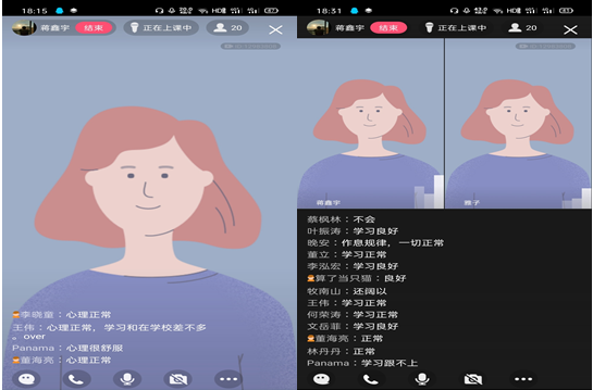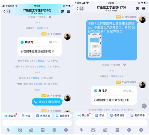 19通信1班的大多数同学疫情期间能做到和线上学习和在课堂学习一样的认真,并且作业完成情况也不错。会议主要还是对班上同学在疫情期间的心理状态进行了了解,吴雅雅老师通过和同学们连麦对话,了解到同学们的心态状态都还不错,并没有因为疫情而导致心理问题。