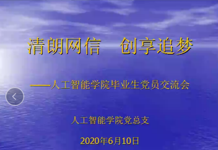 2020年6月10日19点,人工智能学院举行了线上“实习考研交流会”。本次会议由人工智能学院学生第一党支部书记吴雅雅老师主持,参加会议的嘉宾有人工智能学院党总支书记吴茜老师,学生第二党支部书记吴佳曦老师,分团委书记肖宁老师以及16级优秀毕业生代表胡磊、代梦玲、张兴宇、武征晋同学和17级的同学们。