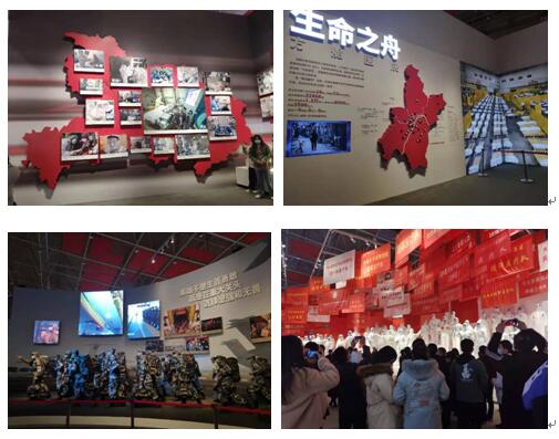 一入门,一面五彩缤纷的祝福留言墙映入眼帘,前方的大屏幕上播放着武汉抗疫的历程,弘扬着二十字伟大抗疫精神:“生命至上,举国同心,舍生忘死,尊重科学,命运与共。”展览以时间历程为参观者讲述了武汉自疫情发生到城市解封,疫苗研发经济恢复的过程,其中包括急救车展览,救治隔离保障流程,病房模拟生死竞速,火神山、雷神山医院模型,方舱医院分布及故事,病毒检测,疫苗研发及感谢信展示等,还原了抗疫各个阶段的布景和抗疫烈士、志愿医疗队模型。